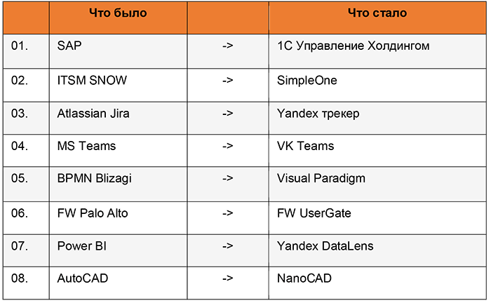 Могу поделиться не самым полным списком тех систем, замены которых, в рамках импортозамещения, мы провели у себя. Возможно, это поможет кому-то из коллег сделать выбор.