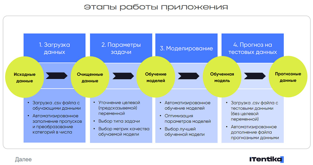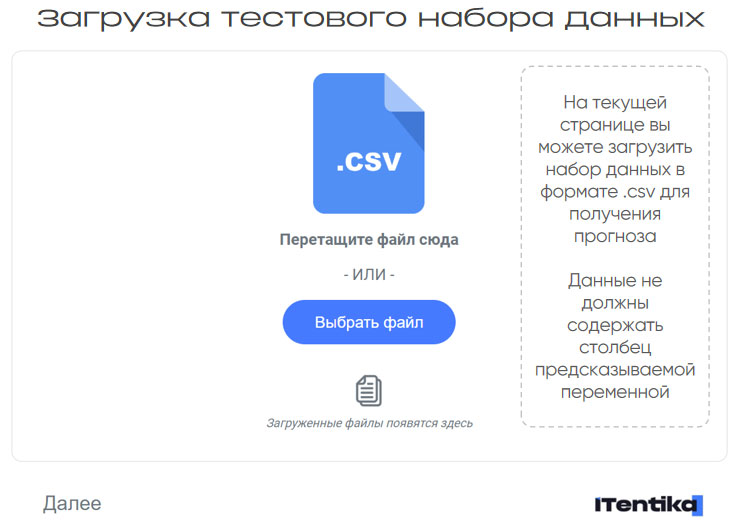 Далее, обученная модель сериализуется, сохраняется и становится доступной для получения прогнозов. На крайнем экране появляется возможность загрузить данные в формате CSV, на которых требуется сделать прогноз (данные без целевой переменной).
