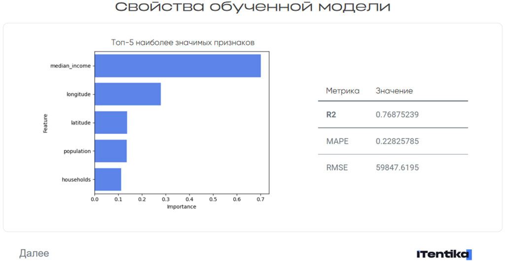 Помимо значения метрик выводятся рейтинг признаков, больше всего влияющих на поведение целевой переменной.
