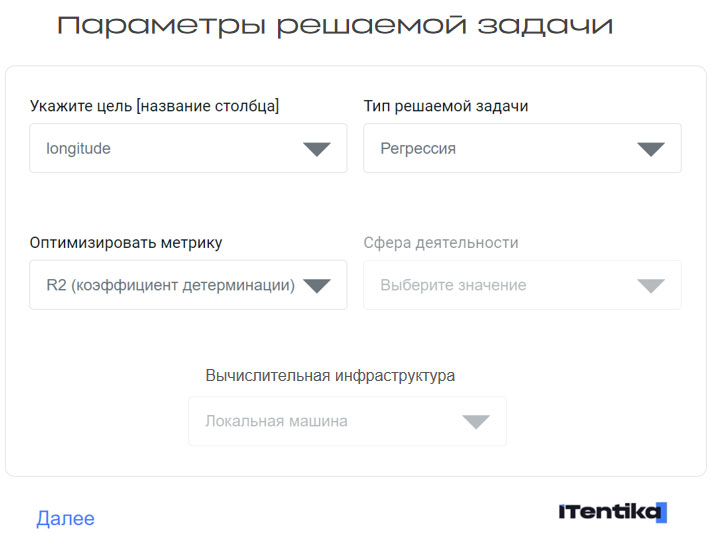 Помимо указанных полей оставлены две «заглушки» для развития продукта в будущем: «Сфера деятельности» и «Вычислительная инфраструктура». Под сферой деятельности понимается доменная область, такая как, финансы, медицина и т.п. Поскольку у нашей компании есть опыт в разработке доменно специфичных решений, то этот опыт мы планируем внедрить в продукт. Например, пользователю в банке потребуется обучить модель для предсказания дефолта заемщика. Для этого пользователь укажет сферу деятельности «Финансы» и тип решаемой задачи, например, «Weight of Evidence».