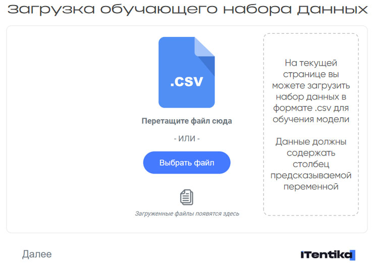 Следующий шаг позволяет загрузить обучающий набор данных в формате CSV. Этот формат крайне популярен при распространении данных, в этом формате можно выгрузить данные из различных учетных систем и т.п. Внутри решения набор данных преобразуется в привычный pandas DataFrame и дальнейшая работа идет с экземпляром этого класса.