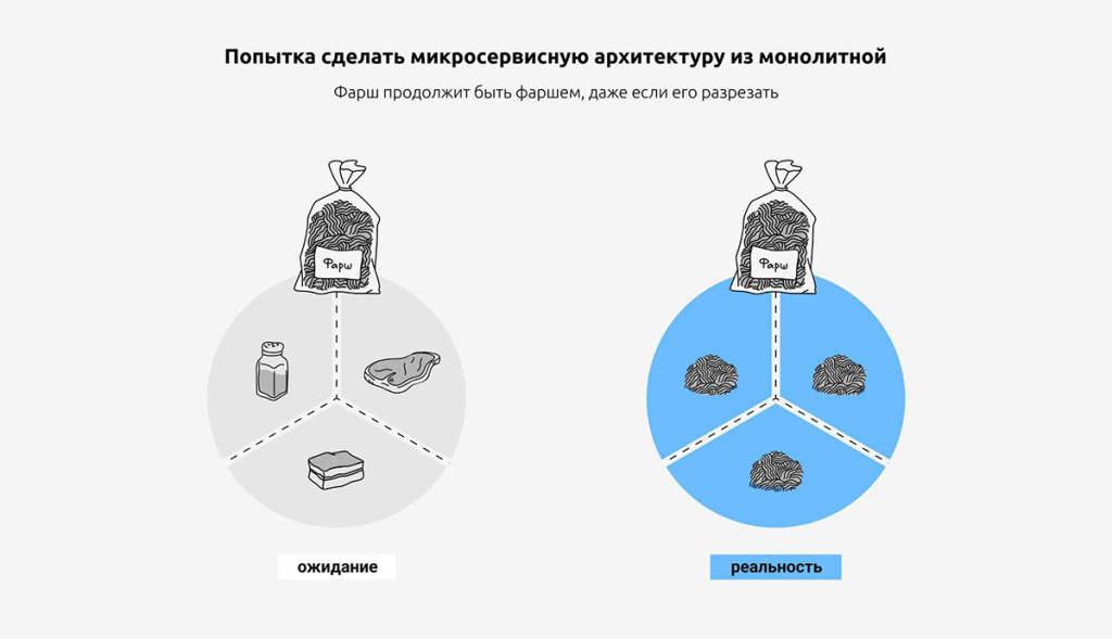 В реальности внедрение микросервисной архитектуры зачастую похоже на попытку разделить ком замороженного фарша на кусочки говядины, шпика и перца. Сколько бы усилий вы ни приложили к распилу монолита ножом IT, на выходе получатся не отдельные ингредиенты, а такие же монолиты, но размером поменьше.