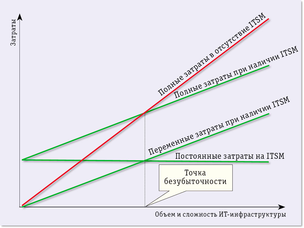В далёком 2013 году в журнале “Открытые системы. СУБД” провели оценку точки безубыточности внедрения ITSM (https://www.osp.ru/os/2013/05/13035995). Схематично идея авторов представлена на рисунке.