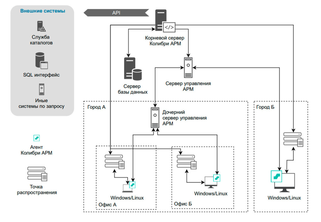 В зависимости от топологии сети, размеров офисов, пропускной способности каналов связи, архитектура установки продукта Колибри-АРМ будет подстраиваться под конкретную компанию. Центральная инфраструктура может размещаться как на одном сервере, так и на распределенных серверах для балансировки нагрузки. Для офисов побольше будут при этом использоваться точки распространения для того, чтобы не нагружать глобальные вычислительные сети. В целом, наша цель передавать и обрабатывать данные только в рамках локальной вычислительной сети, уменьшая нагрузку на глобальные вычислительные сети.