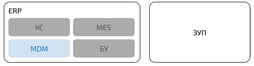 Когда говорим о предприятии, которое активно развивается, но еще не является федеральным игроком на рынке: приобретает другие производственные площадки, открывает связанные юрлица, которые должны работать в едином информационном пространстве, усложняет ИТ-ландшафт с целью улучшения инструментов автоматизации отдельных составляющих бизнеса: например, ERP остается базой для ведения бухгалтерского учета, а клиентский сервис и управление производством выделяются в отдельные базы в рамках ИТ-ландшафта. Здесь уже начинают формироваться предпосылки к перестройке процессов внутри компании, выделение отдельного инструментария для работы с НСИ. В зависимости от дальнейших планов развития здесь выбирают либо 1С:MDM, либо 1С:ERPУХ. О плюсах и минусах выбора систем для MDM мы поговорим в отдельном материале.