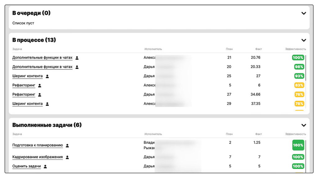 • список выполненных задач и отчет по эффективности их выполнения;