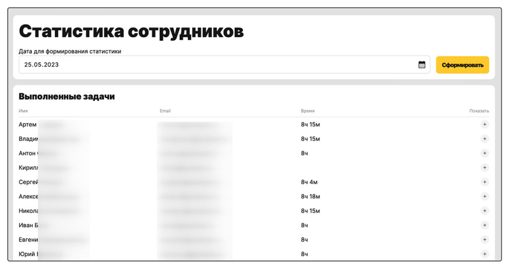 • Показывать статистику по всем сотрудникам. Сколько часов они отработали за конкретный день.