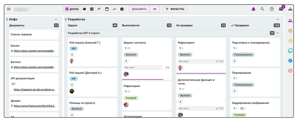 • Есть доска «Инфо», где содержится вся информация по проекту.