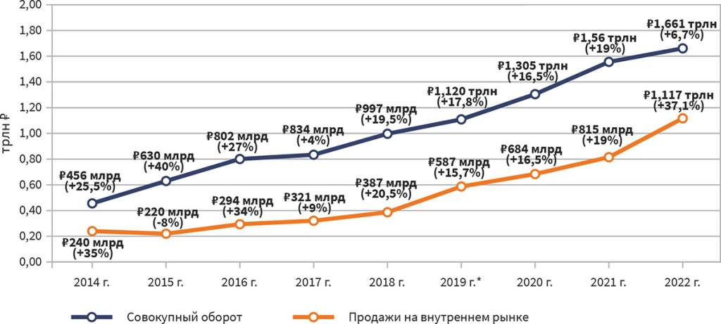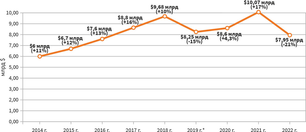 Объем зарубежных продаж в 20014-2022 годах (прирост за год)