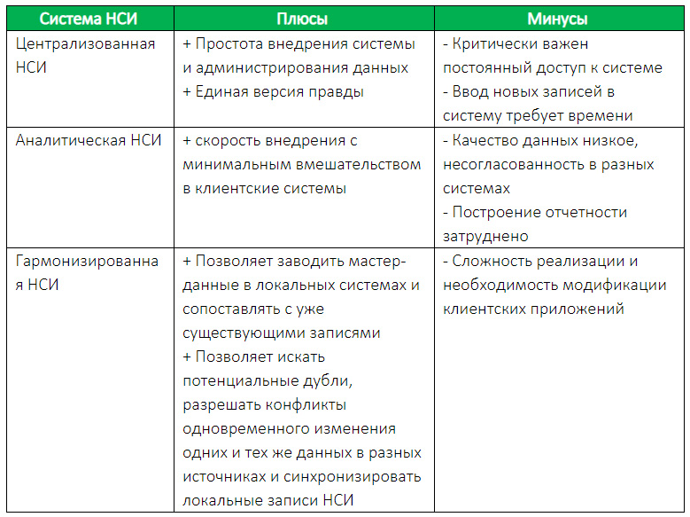 Существует несколько вариантов организации системы НСИ в зависимости от того, как НСИ взаимодействует с клиентскими информационными системами организации. Для каждой из форм организации НСИ характерны свои плюсы и минусы, которые нужно учитывать при выборе подхода к построению системы.