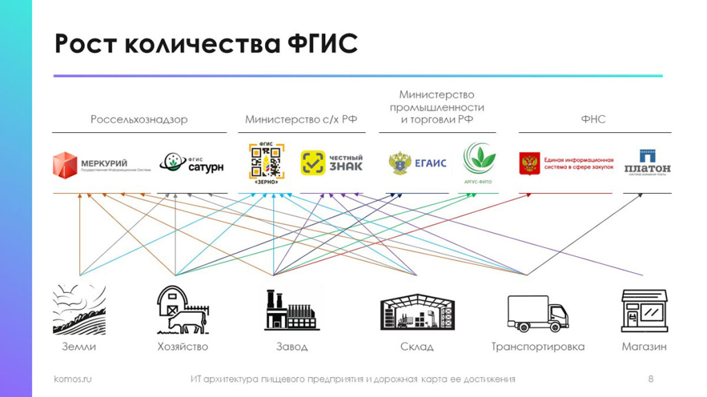 Следующая история, которая болит практически у всех, - рост количества ГИСов: Меркурий, Сатурн, ФГИС Зерно, Честный Знак, ЕГАИС, Аргус Фито, Платон и т.д.