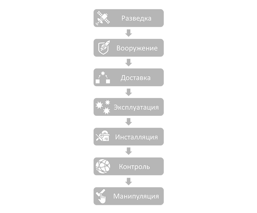 Методику атаки на объекты ИТ-инфраструктуры принято описывать с помощью цепочки KillChain, которая состоит из 7 шагов.