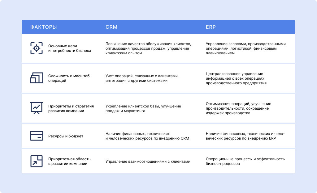 Как показано в таблице, пересечение функционала CRM и ERP если и возможно, то только в некоторых базовых процессах. Ни одно IT-решение не сможет полноценно заменить другое. На крупном производственном предприятии должны быть обе системы, бесшовно интегрированные и дополняющие друг друга.