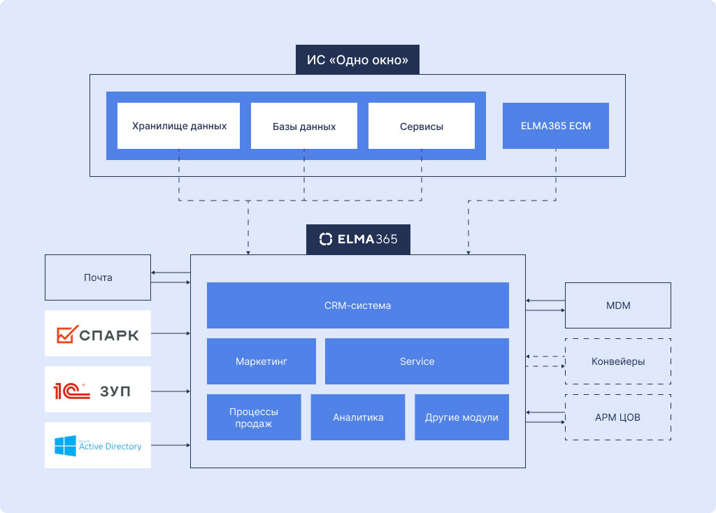 Всегда, когда начинается работа с enterprise-клиентом, мы принимаем во внимание сложившийся за несколько лет, а порой за десятилетия IT-ландшафт компании и подходы к внедрению. Наша задача — аккуратно встроиться в текущую инфраструктуру, соблюдая требования ИБ и архитектора на стороне клиента. Чаще всего проводится интеграция с уже существующей шиной данных, кроме того, у ELMA365 есть поддержка как REST API, так и более «экзотических» вариантов с SOAP или различными брокерами сообщений.