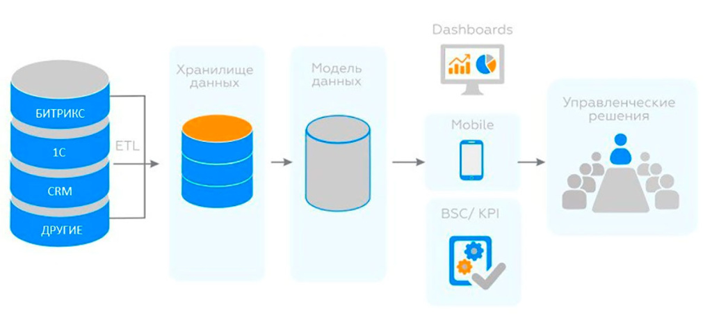 Данные из различных учетных систем загружаются в ваше SQL-хранилище, после чего попадают в BI-систему. На основании загруженных данных строится модель, и на этой модели строятся дашборды. А сами дашборды помогают быстро воспринимать информацию, анализировать её и моделировать.