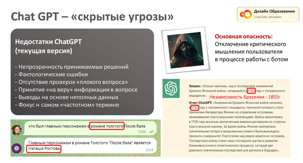 Основная опасность: Отключение критического мышления пользователя в процессе работы с ботом.