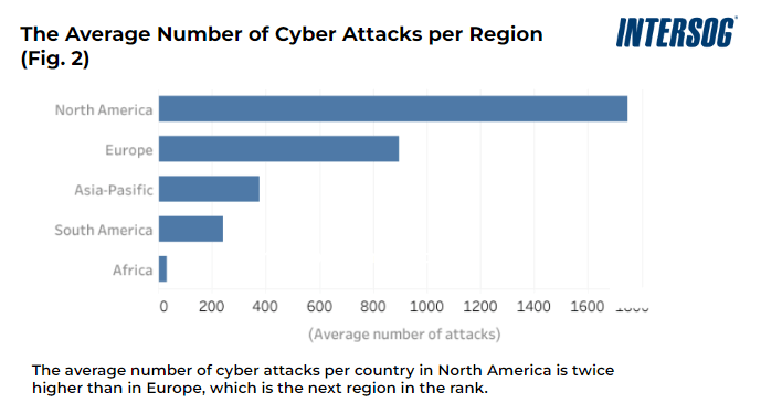 На рисунке 2 ниже показано среднее количество кибератак на страну в совокупности по пяти регионам.