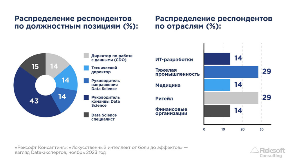 Компания «Рексофт Консалтинг» провела глубинные интервью с экспертами, а именно с техническими директорами, CDO, руководителями направлений и команд Data Science, Data Science специалистами, разрабатывающими и внедряющими цифровые решения на базе ИИ в различных отраслях экономики, чтобы понять с какими проблемами они сталкиваются сегодня. В опросе приняли участие представители промышленности, медицины, финансового сектора, ритейла и ИТ-компаний.