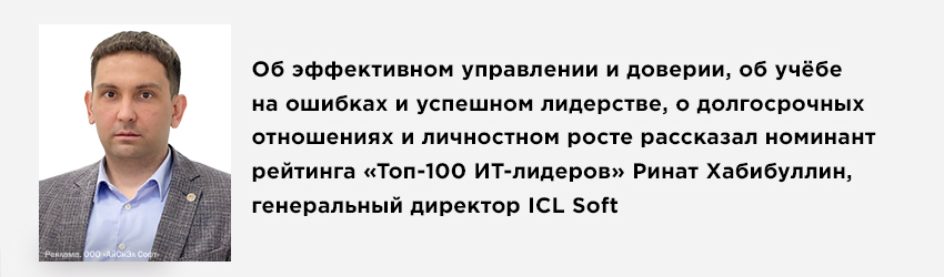 Ринат Хабибуллин: В первую очередь, на мой взгляд, очень важно, чтобы команда понимала и разделяла цели, стоящие перед компанией, и была нацелена на их достижение. Для этого в нашей компании мы проводим стратегические сессии, направленные на совместную выработку внутренних проектов и инициатив, которые позволят достичь этих целей. Также считаю важным создать в компании доверительную атмосферу, чтобы сотрудники не боялись допускать ошибки и высказывать свое мнение, поскольку негативный опыт также важен для достижения результатов. За всё время работы в ICL могу отметить, что руководство всегда было открытым в общении, и я придерживаюсь этих же принципов в своей работе.