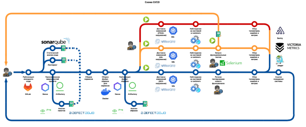 Итак, начинается все с программиста, который выпустил код. Он сразу проверяется SonarQube на безопасность и потом на соответствие стандартам команды. Так код становится единообразным. Далее происходит сборка и доставка информации до дев-среды. На этом этапе проводят разные тестирования, сбор и анализ ошибок, анализ работы системы и т. п.
