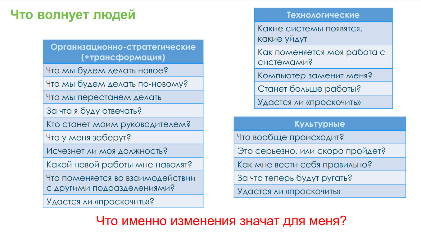 Когда в компании начинаются какие-то либо изменения – технологические, смена руководителя, курса развития – у сотрудников возникают вопросы и возражения. Вот примеры самых распространенных вопросов, с которыми могут столкнуться руководители на старте трансформации: