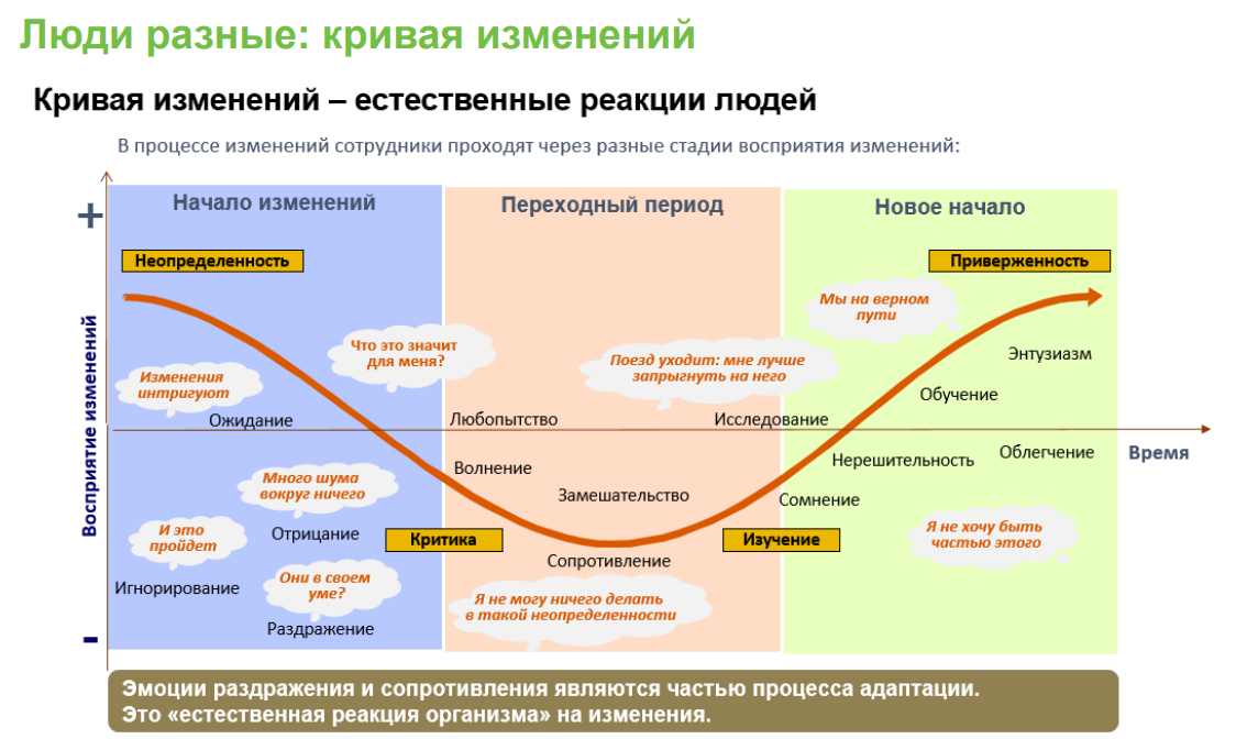 “Кривая изменений” – модель, которая описывает этапы трансформаций и естественные реакции людей на них