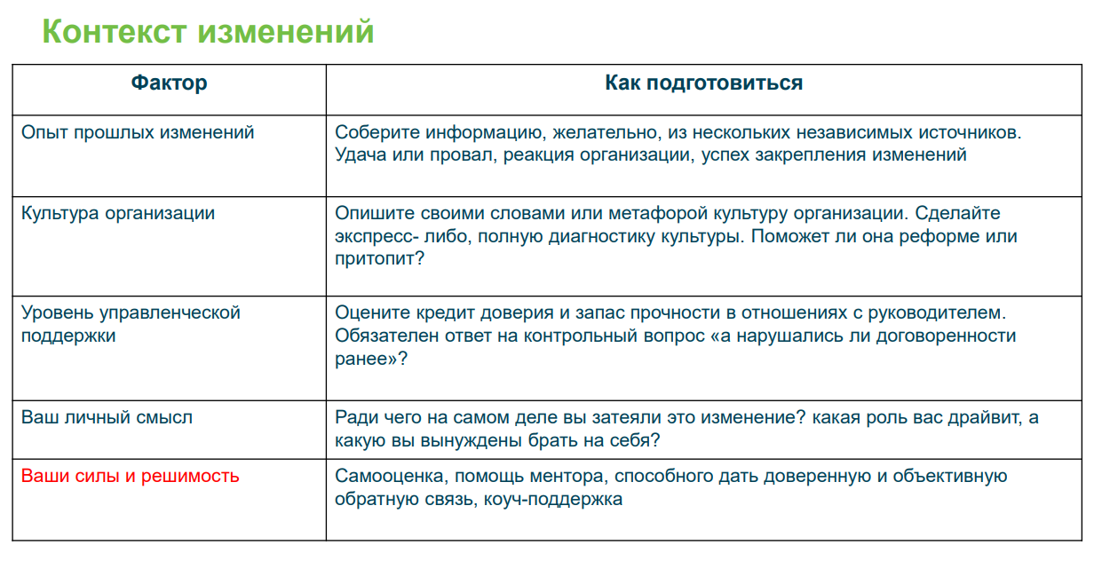 Факторы контекста, конкретизация которых поможет более плавно внедрить изменения в компании