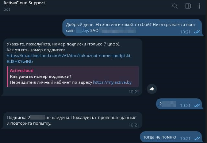 В случае технической консультации бот из контекста способен определить, по какой услуге задан вопрос. Если услуга не имеет вариативности, бот произведет поиск информации для подготовки ответа в базе знаний. Если услуга имеет несколько вариантов (например, почтовая услуга или услуга хостинга), бот запросит номер подписки и домен (почтовый или веб-сайта).