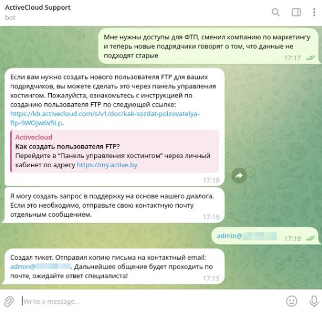 Если диалог затягивается, чтобы не вызвать раздражение пользователя, чат-бот дополнительно предлагает создать тикет в службу поддержки. Саммари диалога отправляется в тикет и на почту пользователя, и далее переписка ведется со специалистами поддержки.