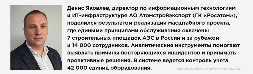 В первую очередь, это повышение качества ИТ-услуг и удовлетворенности ИТ-функцией пользователей наших зарубежных площадок строительства атомных электростанций. Внедрение «КУСТО» на базе Naumen Service Desk позволило уменьшить время простоя информационных систем, снизить количество повторяющихся инцидентов и оптимизировать использование ИТ-активов компании. Помимо этого, сократились затраты на услуги технической поддержки.