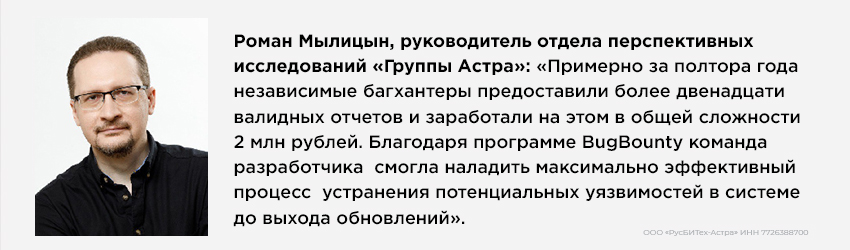 «Группа Астра» первой из российских компаний-разработчиков операционных систем в 2023 году присоединилась к развернутой на платформе BI.ZONE программе Bug Bounty. Ее суть в том, что исследователи безопасности, которые найдут уязвимости и сообщат о них вендору, могут получить до 250 000 рублей в зависимости от критичности найденной ошибки. Это способствует привлечению внешних экспертов к повышению степени безопасности ОС и является важным шагом в борьбе с киберугрозами. Примерно за полтора года независимые багхантеры предоставили более двенадцати валидных отчетов и заработали на этом в общей сложности 2 млн рублей. Благодаря программе команда разработчика смогла наладить максимально эффективный процесс устранения потенциальных уязвимостей в системе до выхода обновлений.