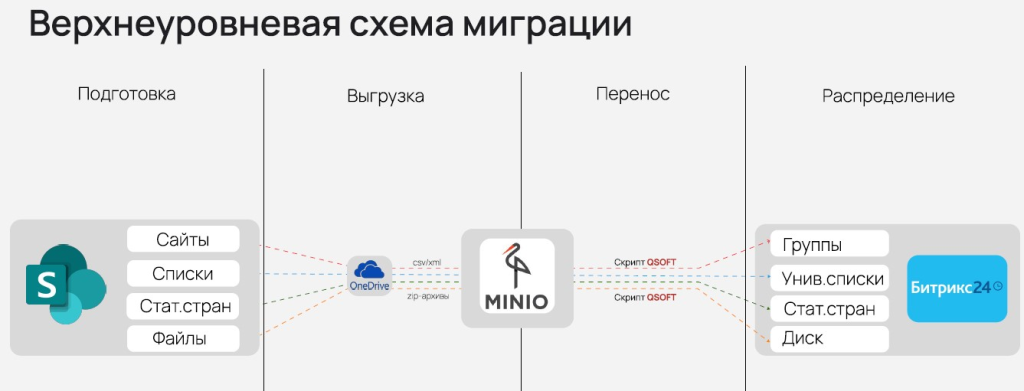 Перенос данных – это процесс копирования информации из MS SharePoint в хранилище корпортала на Битрикс24 с использованием скриптов, разработанных QSOFT. Они обеспечивают: