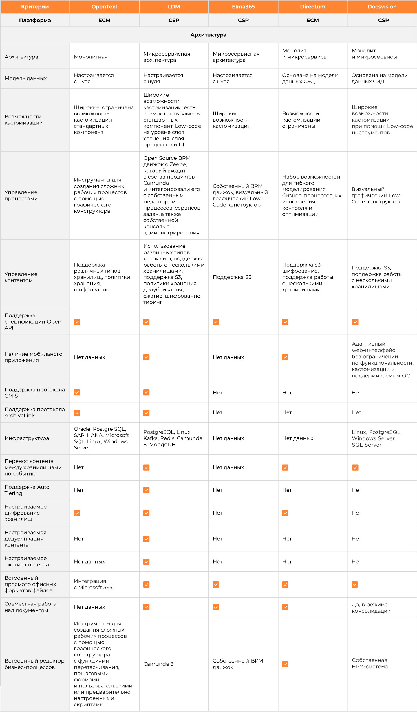 Для удобства сравнения всех отечественных ECM/CSP-платформ мы подготовили таблицу: