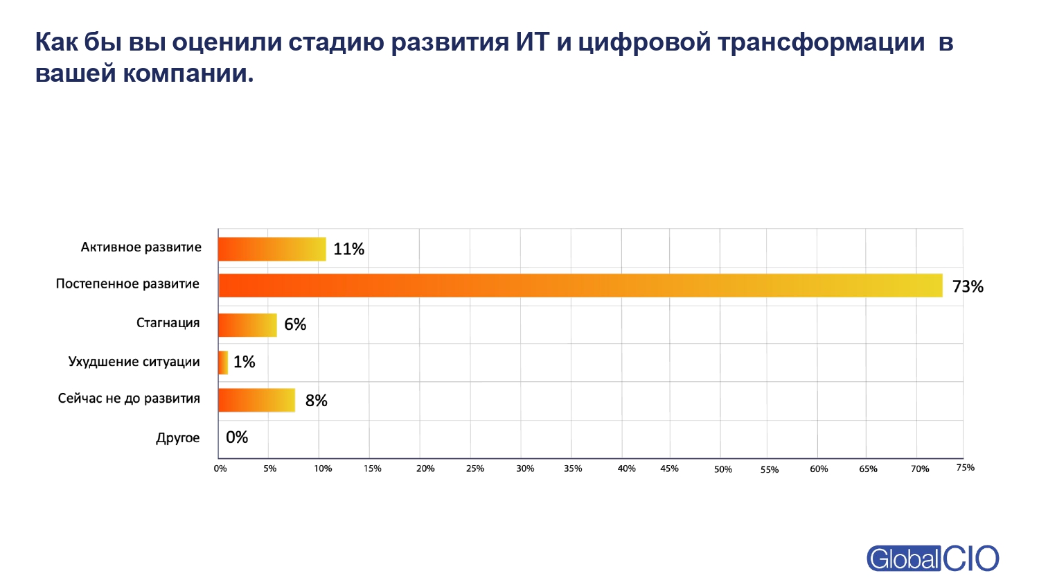 Большинство участников опроса — 73% — оценивают развитие ИТ и цифровой трансформации в своих компаниях как постепенное. Это говорит о зрелом и прагматичном подходе: компании больше не гонятся за громкими инициативами, а концентрируются на последовательных улучшениях процессов и инфраструктуры.