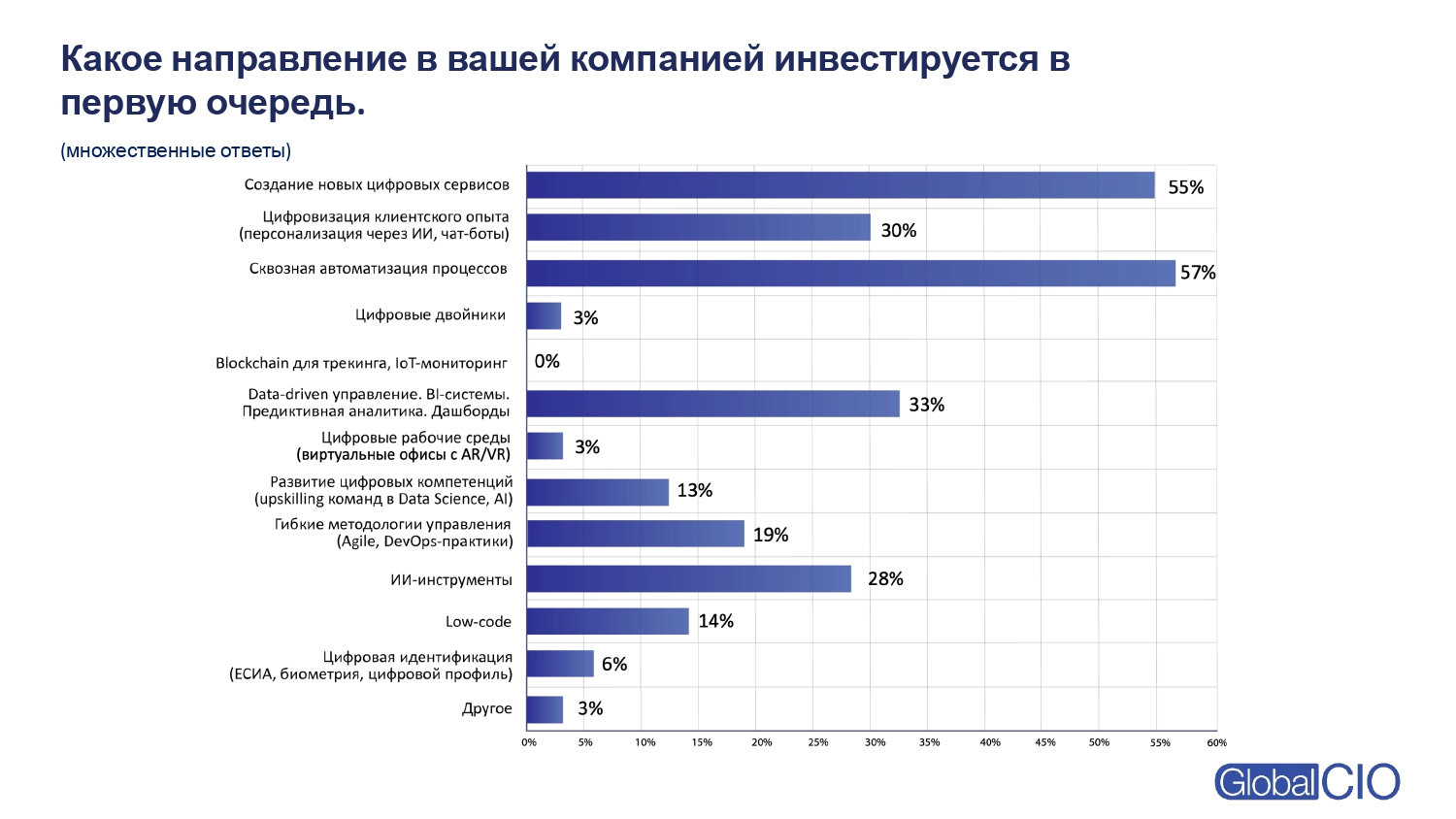 Если говорить о направлениях развития бизнеса через ИТ, лидирует сквозная автоматизация процессов — 57%. Следом идут создание новых цифровых сервисов (55%) и data-driven управление: BI-системы, предиктивная аналитика и дашборды (33%).