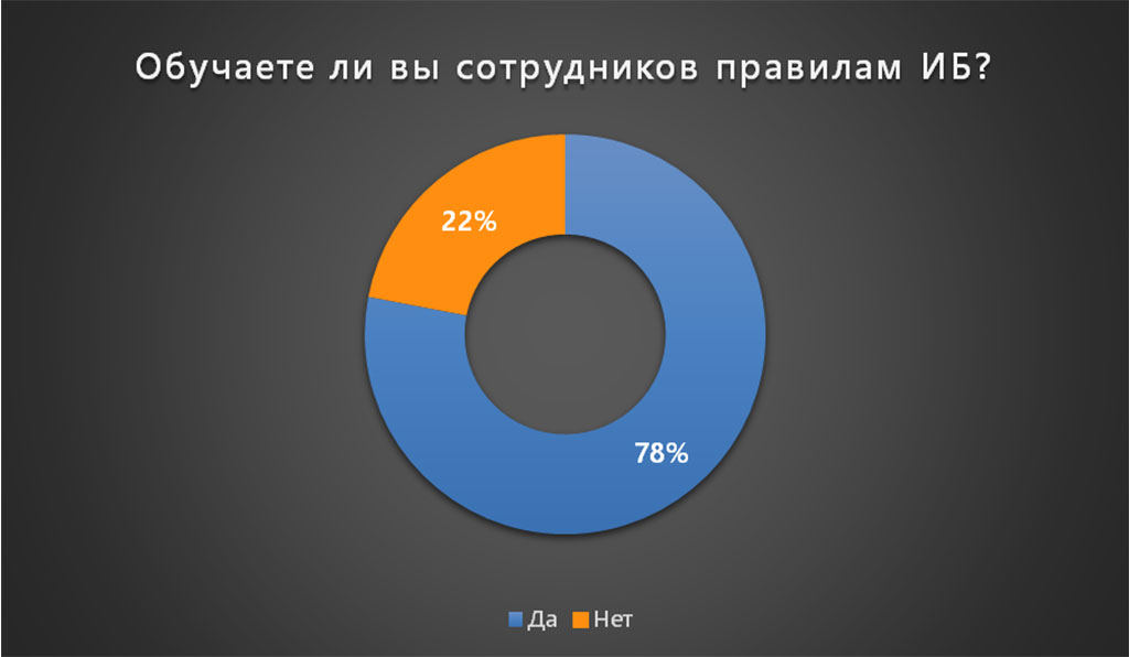Подавляющее большинство (78%) компаний уделяют внимание повышению ИБ-грамотности сотрудников. Из них 59% составляют письменные регламенты, которые сотрудники должны изучить самостоятельно – это самая популярная форма обучения.