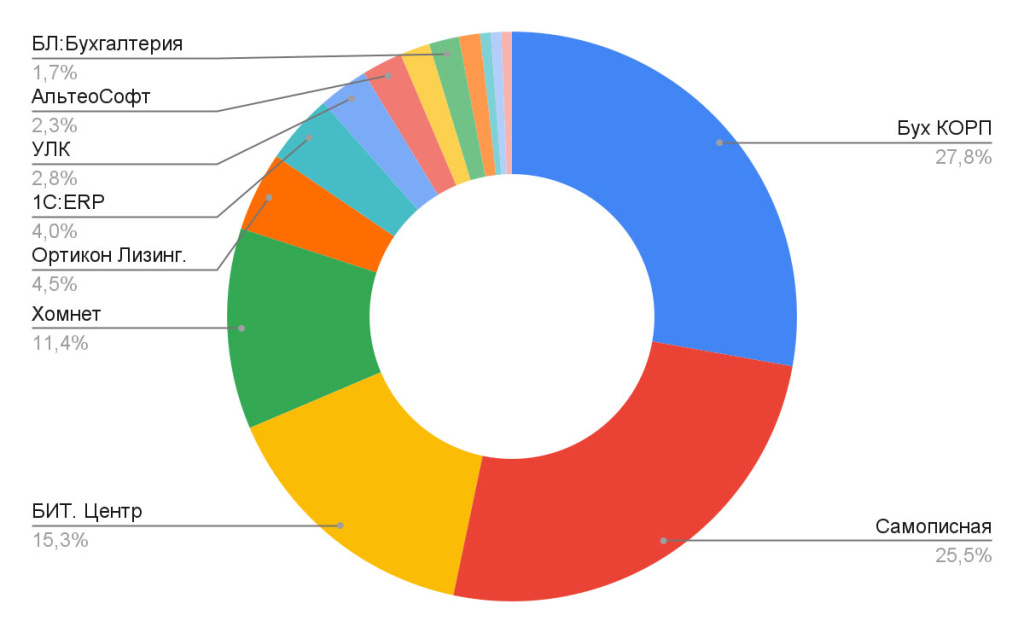 В 2023 году 27,8% лизинговых компаний используют для ведения профильной деятельности программу Бух Корп. Почти столько же компаний - 25,5% - пользуются самописными программами, поддерживая софт силами собственных специалистов.