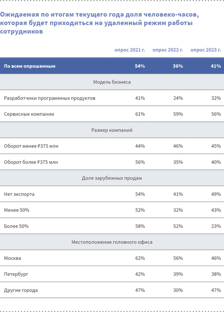 В 2021 году 54% человеко-часов работы опрошенных компаний пришлось на работу вне офиса. В 2022 году этот показатель снизился до 36%, а в 2023 году возрос до 41%. Если экстраполировать эти данные на всю индустрию, то получается, что доля удаленной работы в эти годы составляла 55%, 42% и 44% соответственно.
