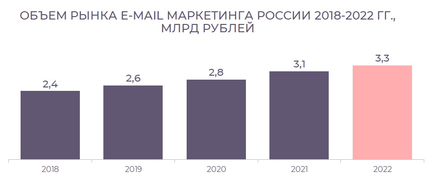 В 2022 году наибольшую долю на рынке email-маркетинга в России занимали компании FMCG (16%) и финансового сектора (14%) с объемами 530 млн и 480 млн рублей соответственно. Третье место у представителей индустрии медиа и развлечений (450 млн рублей и 13,5%). В меньшей степени email-сервисами пользовались компании из индустрии транспорта и логистики (9%), образования (8%) и туризма (7%).