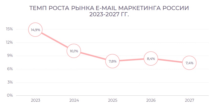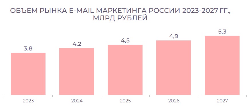 В следующем году рынок email-маркетинга, согласно прогнозу DashaMail, также ожидает высокий темп роста – 10,1%. Объем составит 4,2 млрд рублей, а затем темпы вернутся к прежним среднегодовым значениям (около 7,9%). К 2027 году общая выручка достигнет 5,3 млрд рублей, что на 40% больше, чем в 2023 году.