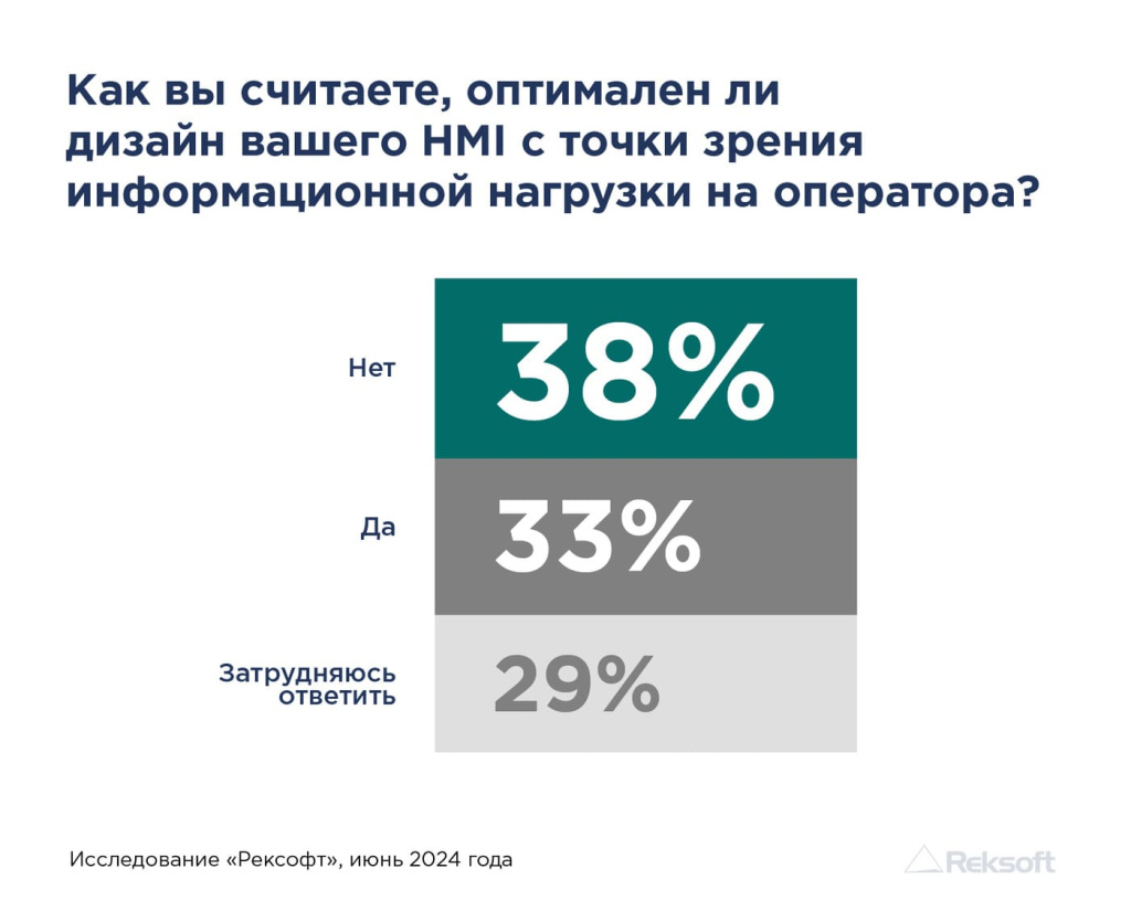 Только треть опрошенных утвердительно ответили, что их организации располагают нормативными документами, которые грамотно описывают дизайн HMI и регламентируют технологические процессы. Подобные материалы критически важны для увеличения эффективности работы производственных площадок. Кроме того, только 33% специалистов считают свой текущий дизайн HMI оптимальным.