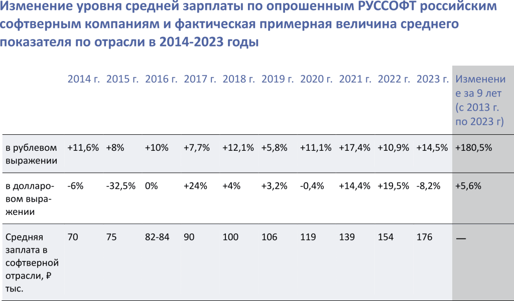 В 2023 году, согласно данным Росстата, среднемесячная номинальная зарплата по всей экономике России увеличилась примерно на 14,6%, достигнув почти ₽75 тыс.. В софтверной индустрии РУССОФТ определил точно такой же прирост, который не противоречит другим данным об изменении зарплаты в ИТ-сфере. Эти «другие» данные могут отличаться от результатов Исследования РУССОФТ. Связано это с тем, что речь идет о разных показателях. Одни могут отражать средний уровень зарплаты, предложенной для набора новых сотрудников, а другие – среднюю ожидаемую зарплату ищущих работу специалистов. Речь может идти как о средней медианной, так и об обычной средней зарплате работающего персонала. Кроме того, при оценке среднего уровня заплаты может охватываться разный круг специалистов – все ИТ-специалисты отрасли, сотрудники ИТ-компаний из разных ИТ-сегментов, все сотрудники только софтверных компаний, только разработчики ПО и т.д.