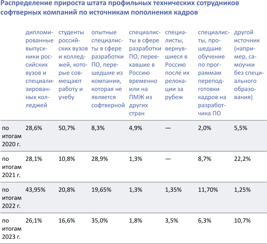 В 2022 г. на рынке труда сложилась особая ситуация. Значительные кадровые потери софтверной индустрии были связаны с массовым выездом специалистов за рубеж. Совокупная численность персонала компаний почти никак не изменилась: новые для отрасли сотрудники только компенсировали этот отток. В целом их оказалось меньше, чем в предыдущие годы. Ситуация не благоприятствовала переходам в поисках лучших условий. Потому приток кадров из других отраслей сократился. На этом фоне увеличилась доля специалистов, которые только что окончили вузы или совмещают работу с учёбой, при том, что численность этих специалистов изменилась незначительно.