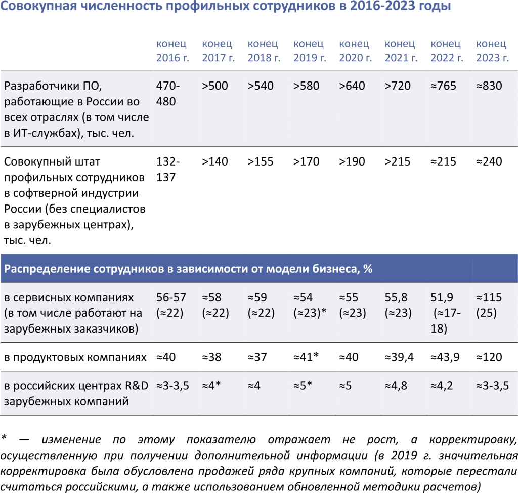 Всего в российских софтверных компаниях на конец 2023 г. работало 380 тыс. чел. Из них на профильных технических специалистов приходится в среднем 65% (у сервисных компаний около 75%, а у продуктовых – 58%). Если не ограничиваться софтверной отраслью, а рассматривать предприятия всех отраслей вместе с государственными органами, то в России работает примерно 830 тыс. специалистов в области разработки ПО.