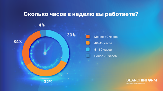 4% ИБ-специалистов проводят на рабочем месте более 70 часов в неделю, а это 14 часов при пятидневной рабочей неделе.
