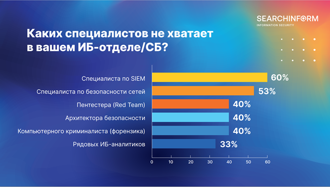 60% опрошенных заявили, что в их ИБ-отделах для полноценной работы не хватает специалиста по SIEM. * Также крайне востребованными оказались специалисты по безопасности сетей, в них нуждается каждая вторая служба ИБ (53% опрошенных). *