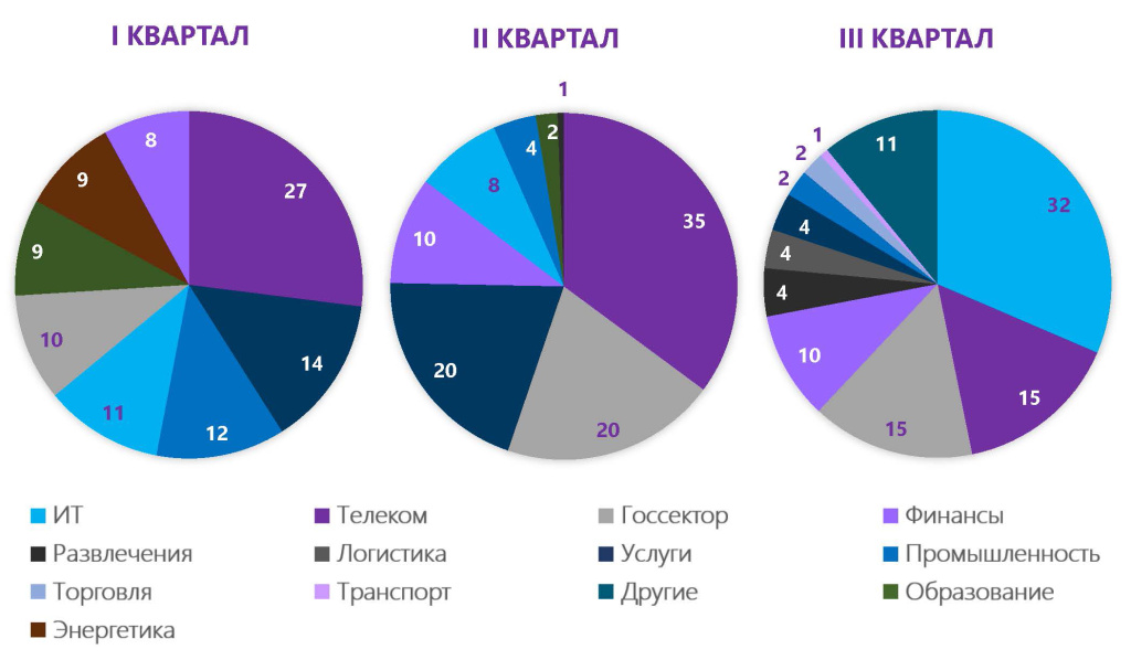 В III квартале снизилась интенсивность атак на телеком: с пиковых 35% во II квартале до 15%. При этом выросла доля DDoS на компании ИТ-сферы: с 11% до 32% относительно начала года. Атаки на финансовый сектор показали несущественное увеличение: с 8% в I квартале до 10% во II и III кварталах. Доля атак на сферу развлечений (преимущественно, на игровые сервисы) изменилась с 1% во II квартале до 4% в III квартале.