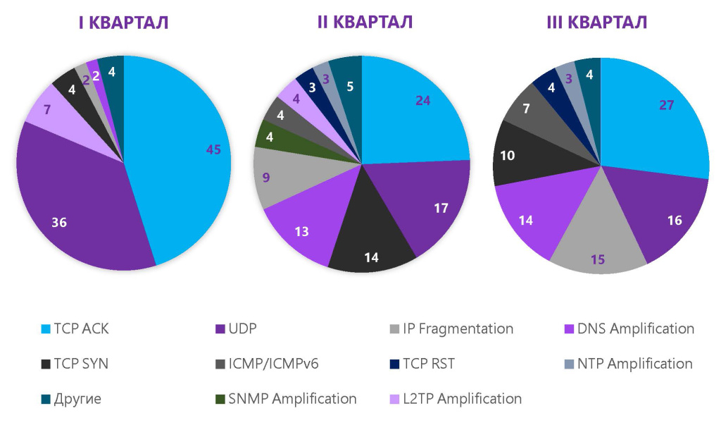 Распределение атак по месяцам показывает закономерность: атаки TCP ACK прошли пик с долей в 41% в августе, хотя уже в сентябре сократилась до 32%. Количество атак IP Fragmentation уменьшилось с 23% до 14%. Также устойчивое снижение в третьем квартале показали флуд DNS amplification (с 21% до 9%), TCP SYN (с 13% до 8%) и TCP RST (с 8% до 2%).
