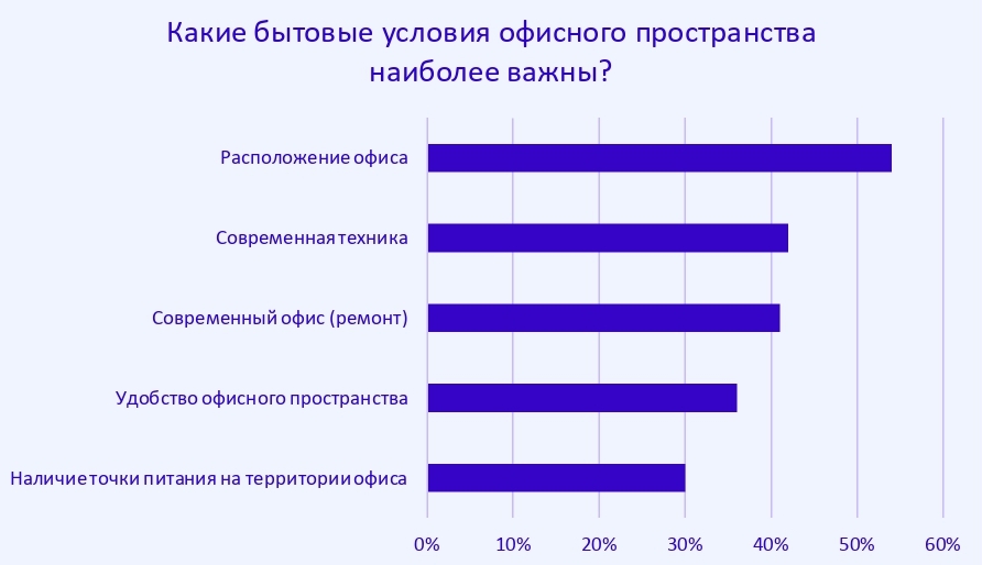 Больше всего внимания опрошенные уделяют самому расположению бизнес-центра (54%), предоставлению топовой техники (42%), современному ремонту (41%), удобству офисного пространства (36%) и наличию точки питания на территории офиса (30%). Для 20% крайне важно иметь возможность выбора удобного кресла. Только 11% респондентов отметили, что работают удаленно и им все это неважно.