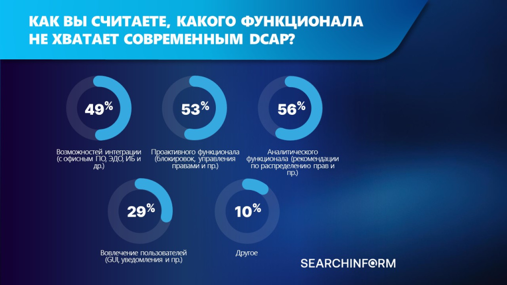 В рамках опроса ИБ-специалисты высказались о перспективах развития рынка DCAP и ответили на вопрос о том, чего ожидают от функционала систем. Больше половины (56%) считают, что современным системам не хватает аналитического функционала. 53% хотели бы видеть в современных DCAP проактивный функционал. 49% ответили, что современным DCAP не хватает интеграции с другим ПО.*